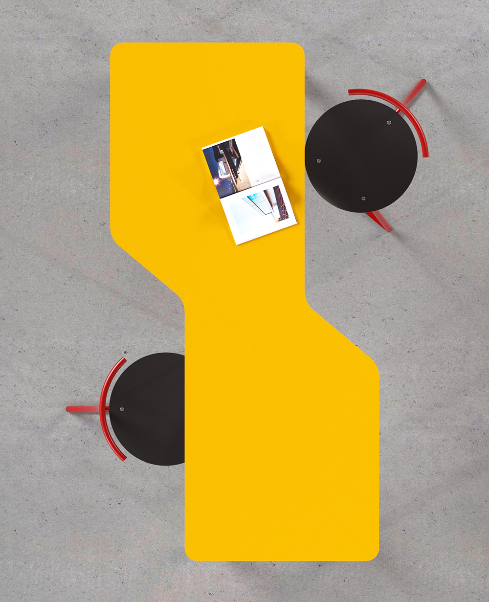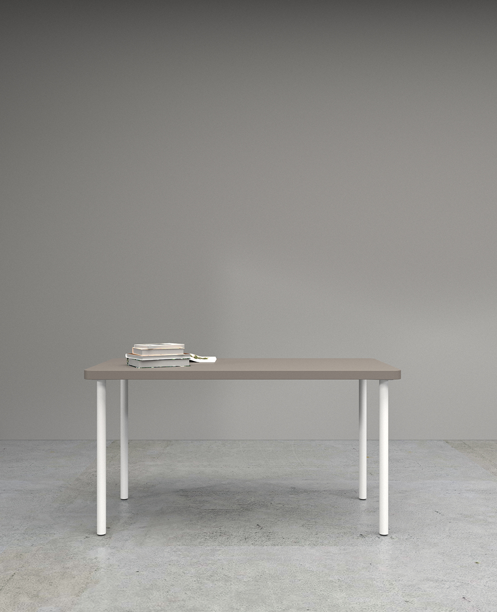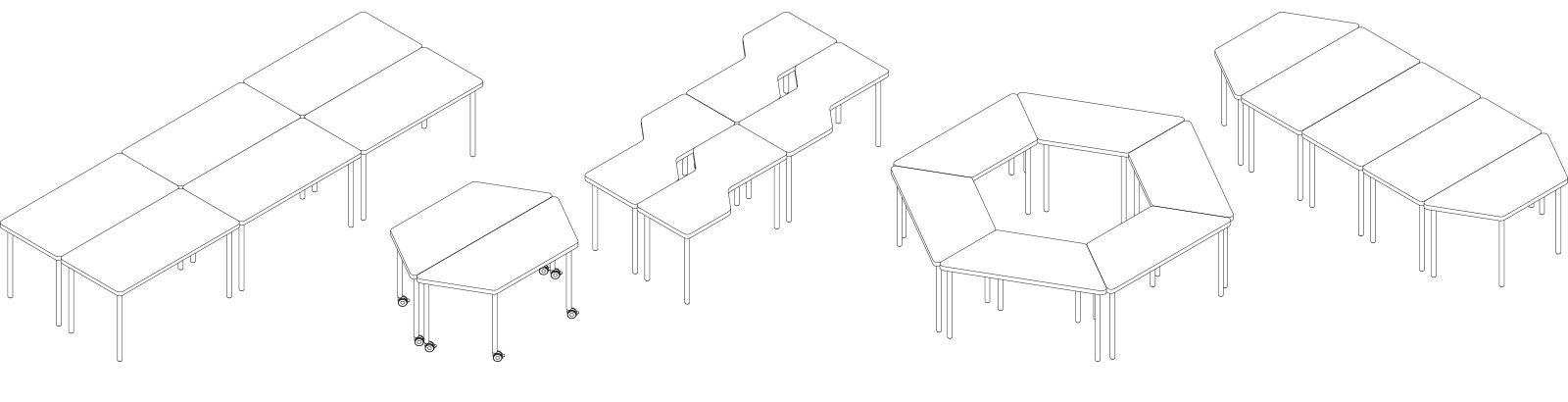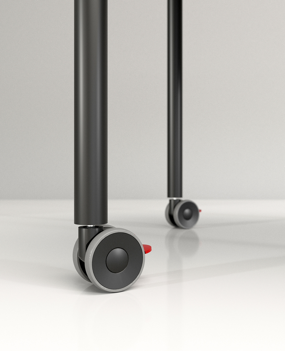 Mesa con tableros de dibujos diversos que permiten variadas configuraciones. Estructura en tubo de sección circular. Posibilidad de aplicación de ruedas con freno.