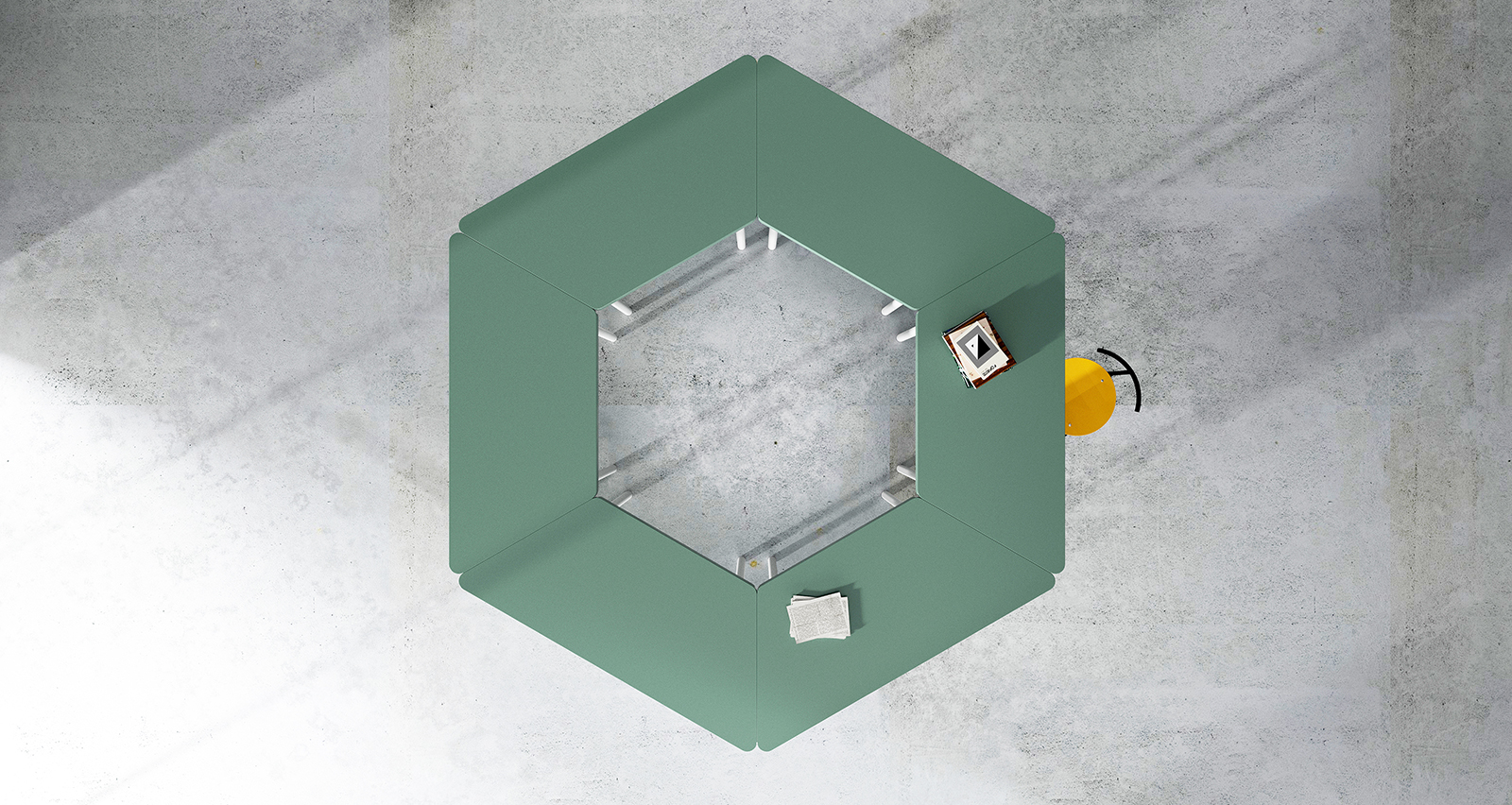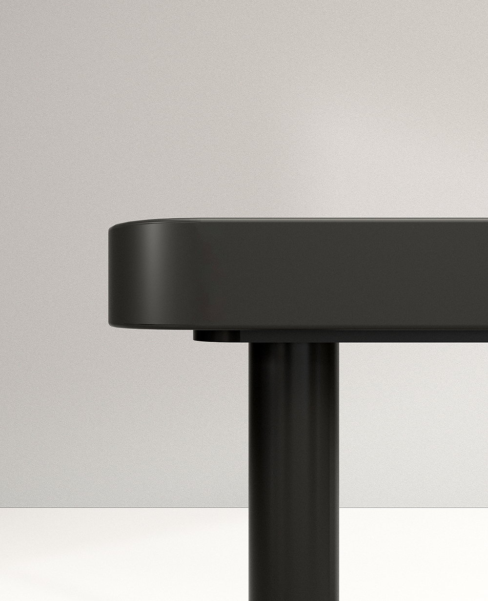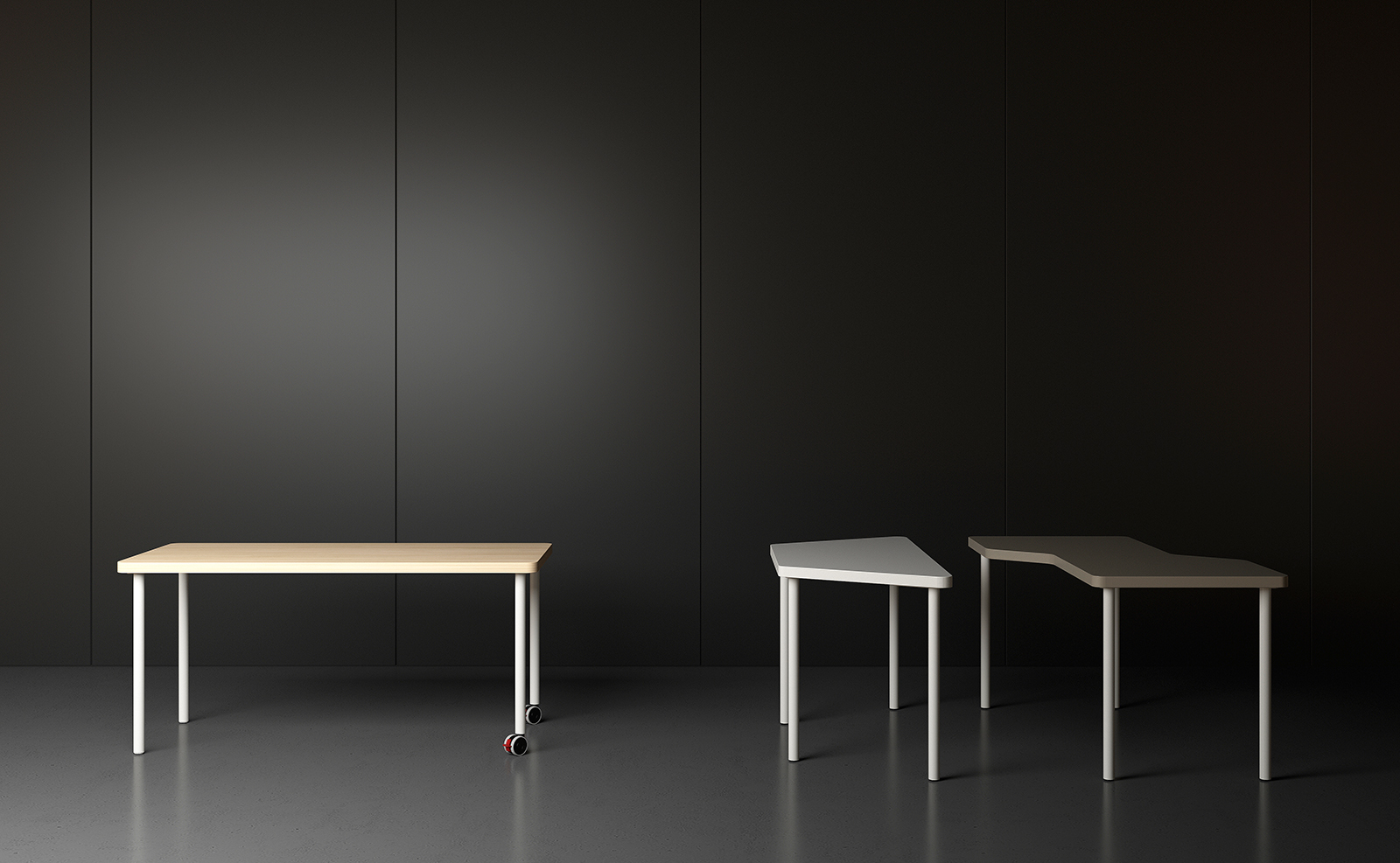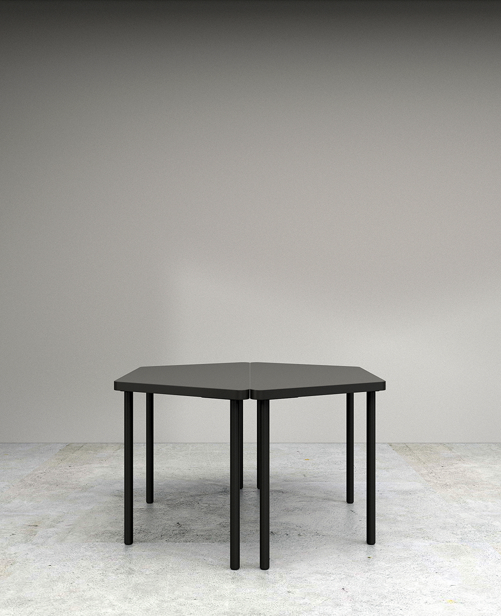 Mesa con tableros de dibujos diversos que permiten variadas configuraciones. Estructura en tubo de sección circular. Posibilidad de aplicación de ruedas con freno.