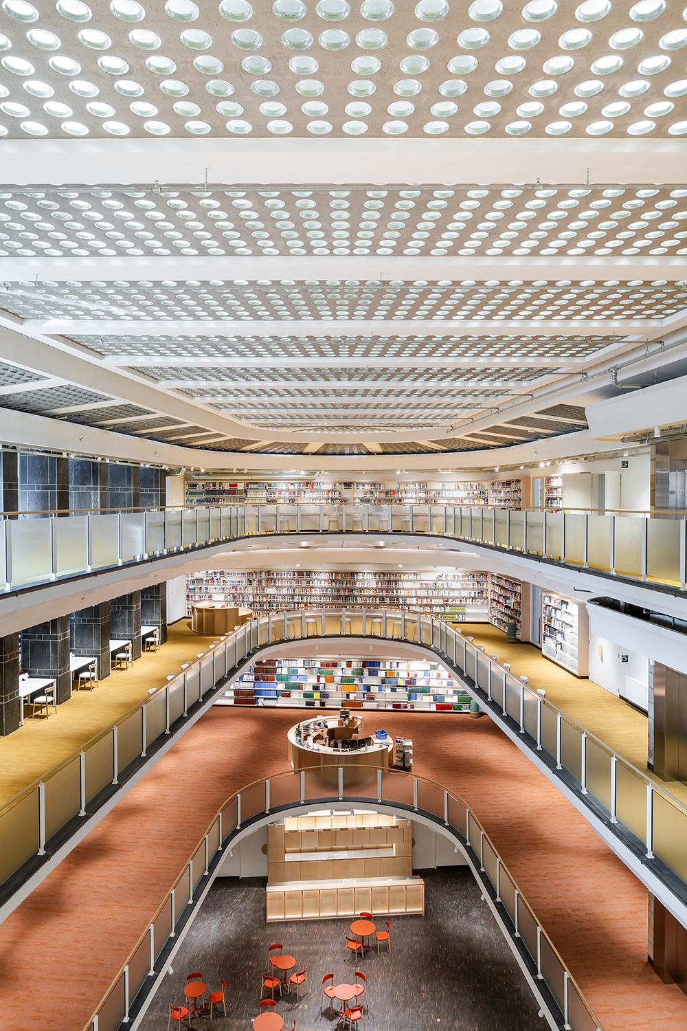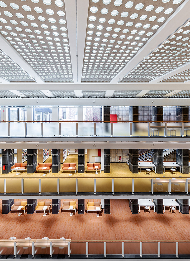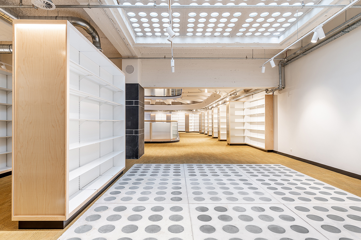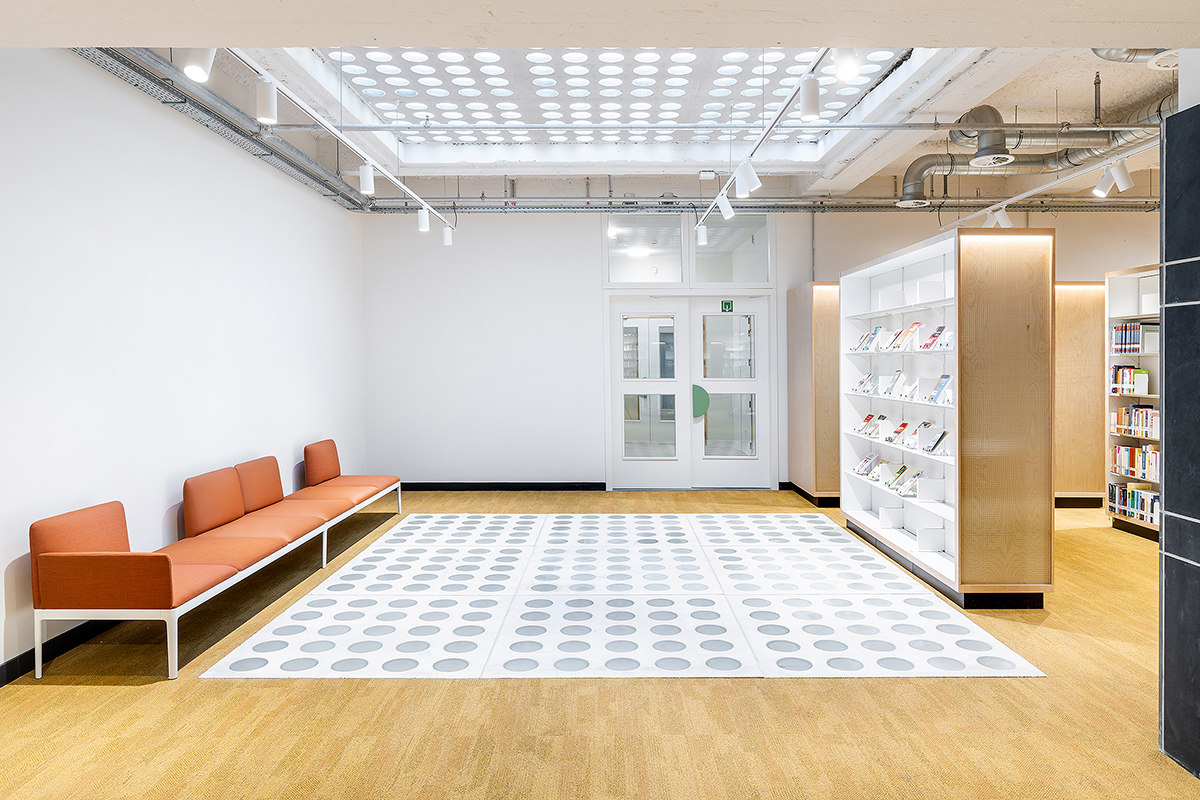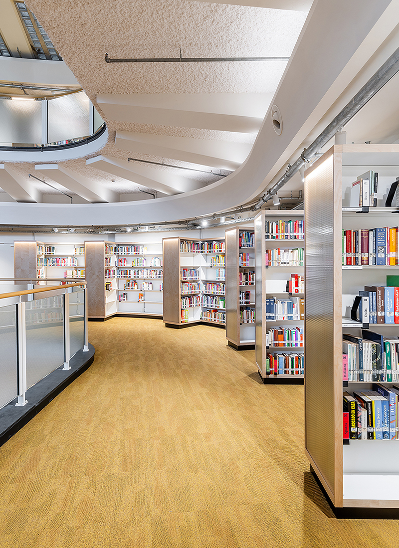 Baseando-se no sistema de estantes Nova, as diversas estantes desenvolvidas adaptam-se às diferentes necessidades do projecto, variando entre as estantes simples e duplas mais convencionais, até às estantes altas fixas à parede, com segmentos curvos que se ajustam à morfologia do edifício. Os rodapés pretos elevam o corpo principal da estante, que é composto por bastidores e por prateleiras de fundo e topo folheados a madeira de bétula. Os bastidores incluem ainda um vidro aramado com retroiluminação. As prateleiras em chapa mantêm o ajuste em altura de 30 em 30 mm, característico da estante Nova.