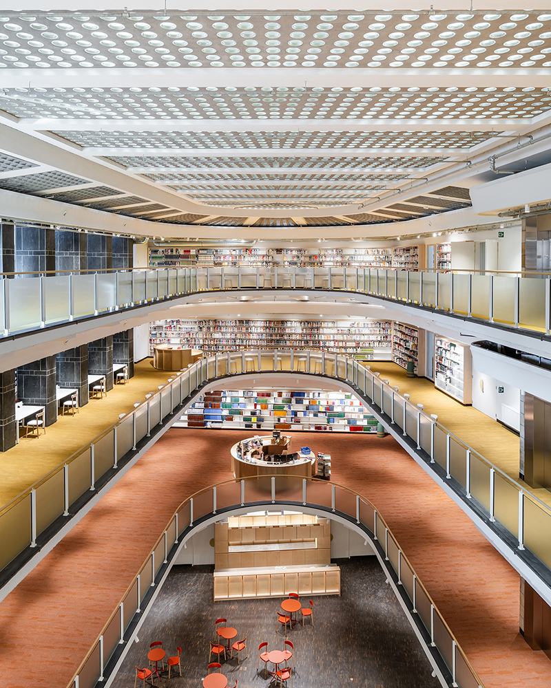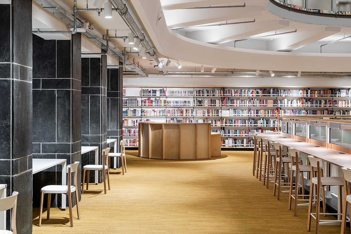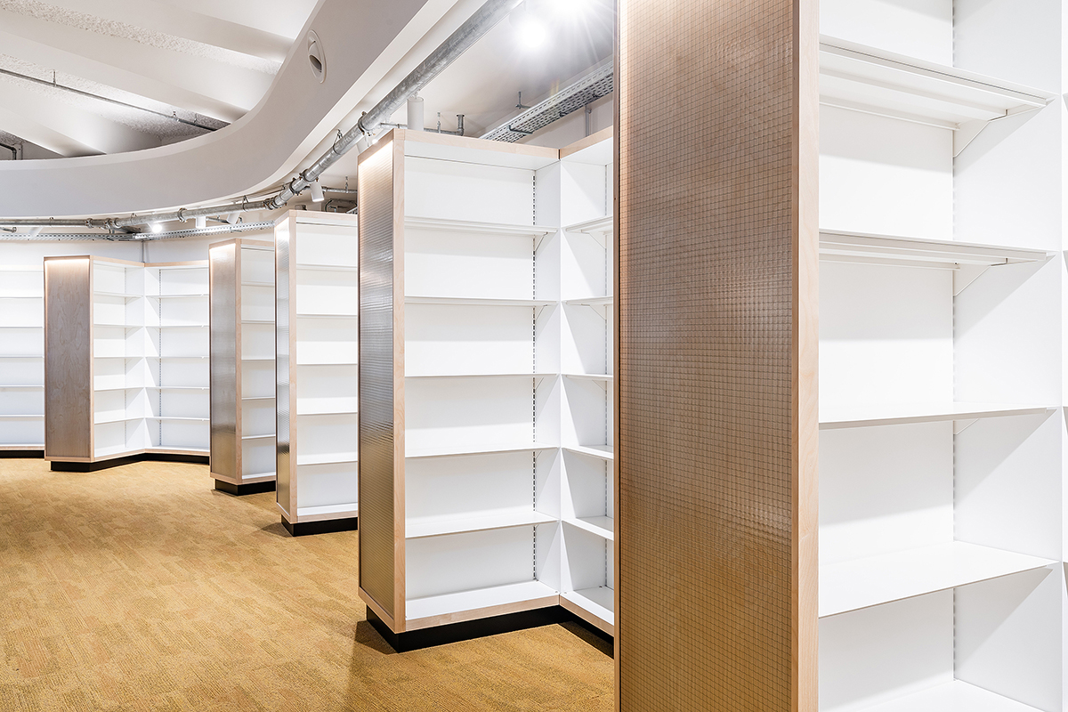 Baseando-se no sistema de estantes Nova, as diversas estantes desenvolvidas adaptam-se às diferentes necessidades do projecto, variando entre as estantes simples e duplas mais convencionais, até às estantes altas fixas à parede, com segmentos curvos que se ajustam à morfologia do edifício. Os rodapés pretos elevam o corpo principal da estante, que é composto por bastidores e por prateleiras de fundo e topo folheados a madeira de bétula. Os bastidores incluem ainda um vidro aramado com retroiluminação. As prateleiras em chapa mantêm o ajuste em altura de 30 em 30 mm, característico da estante Nova.